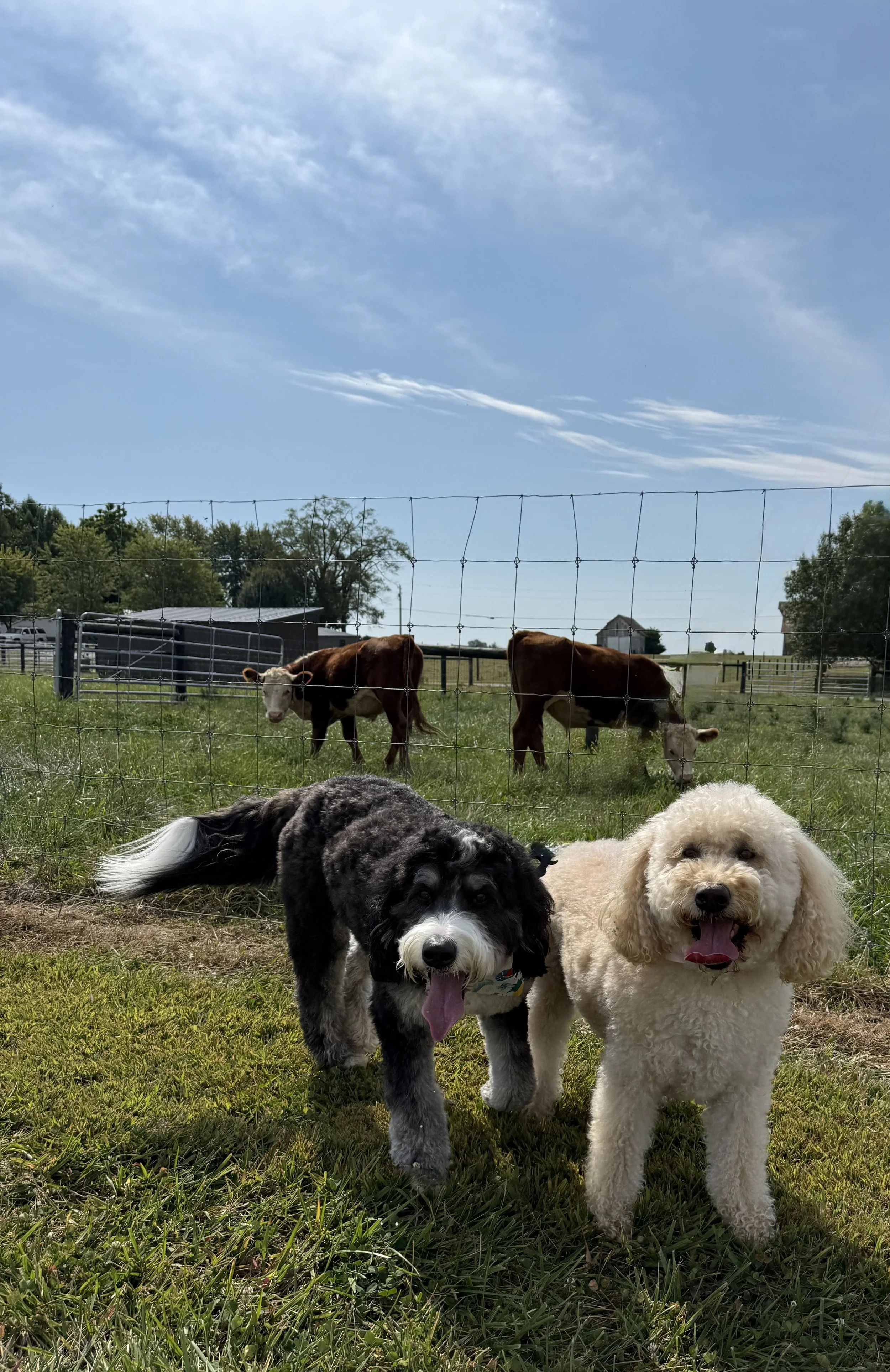 “Our favorite place is the dog park! We love the wide open, fenced in space for them to run, the fun playground that they can use and the security of knowing that it’s a safe place for them to play and have fun. We also love the farm and visiting the cows and horses. They have such big personalities and Olive and Luna like saying hi!”